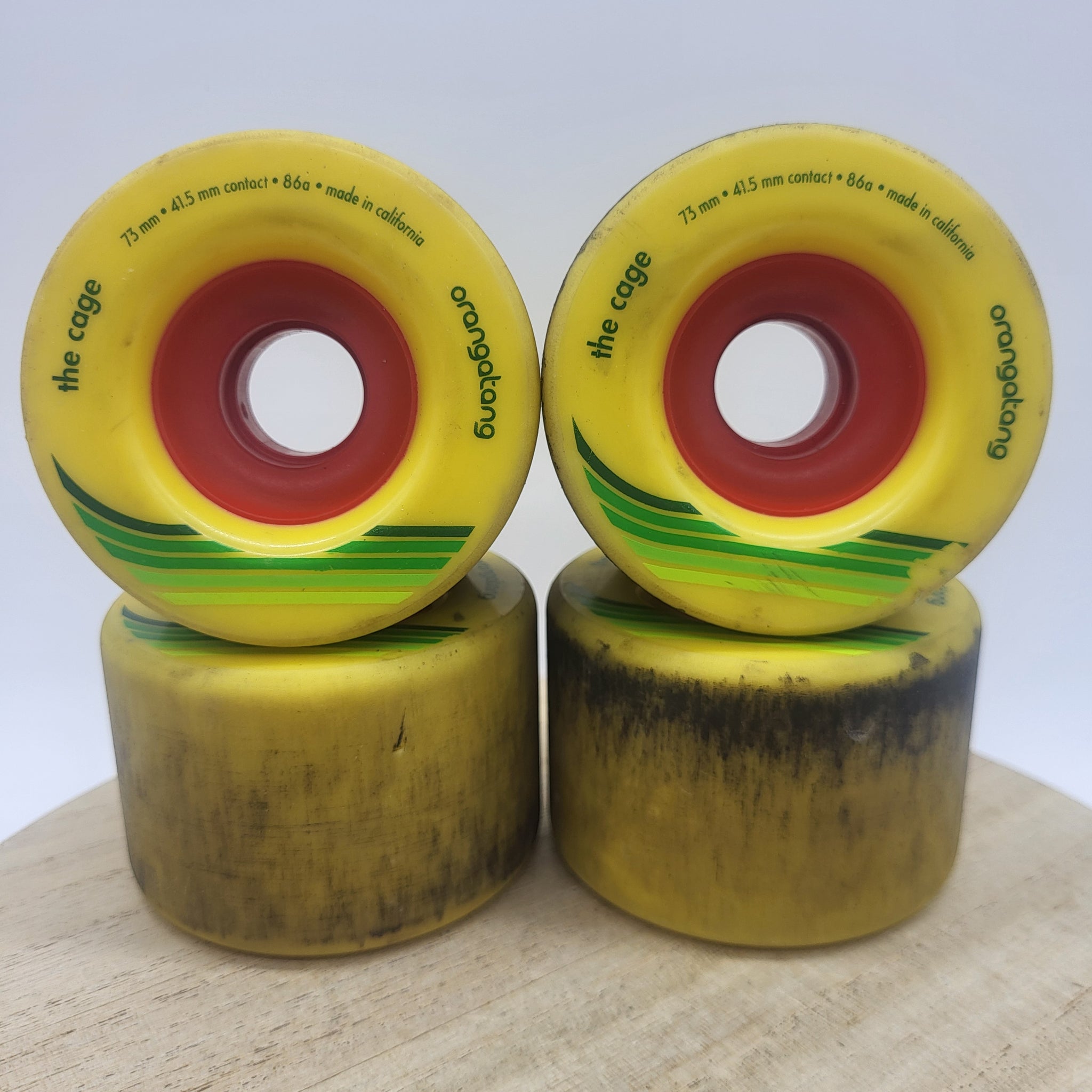BRAND: OrangatangMODEL: The CageSIZE: 73mmCONTACT PATCH: 41.5mmDURO: 86aBEARING PLACEMENT:SKIN: StonegroundCONDITION: 8/10NOTES: Discontinued