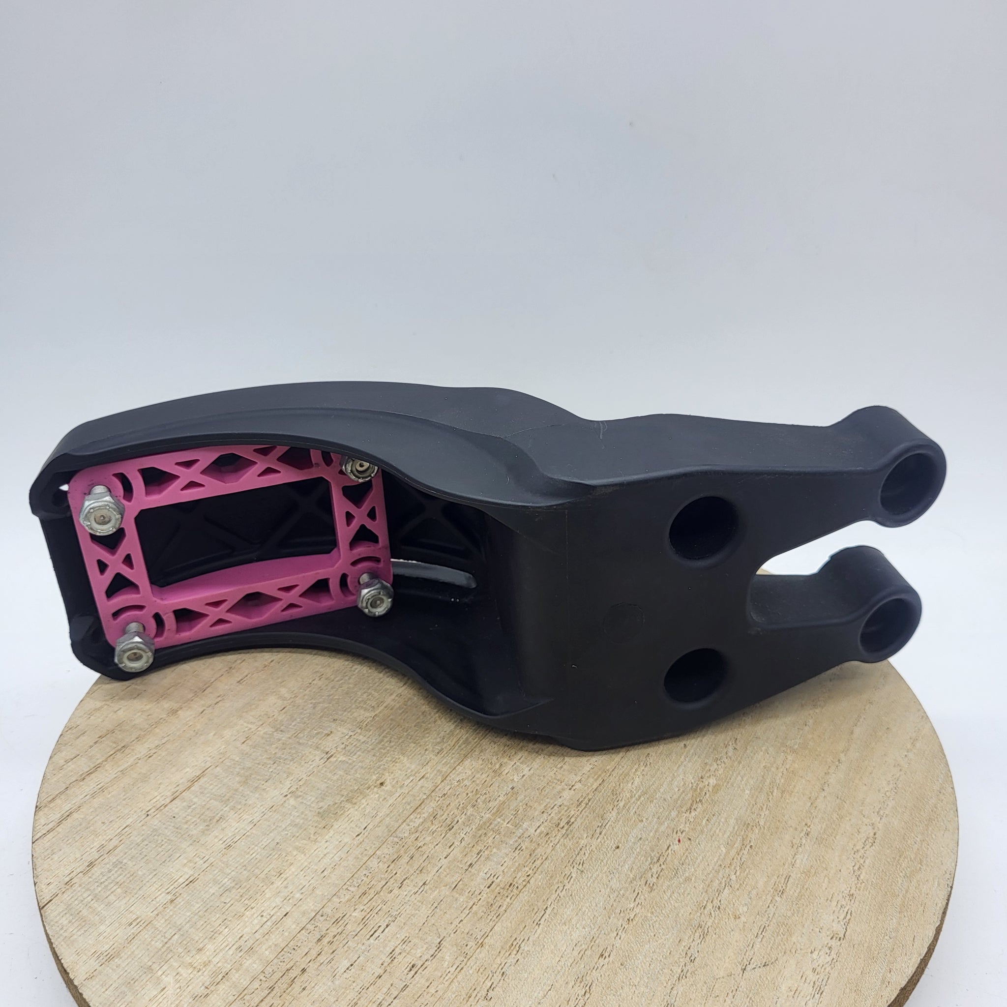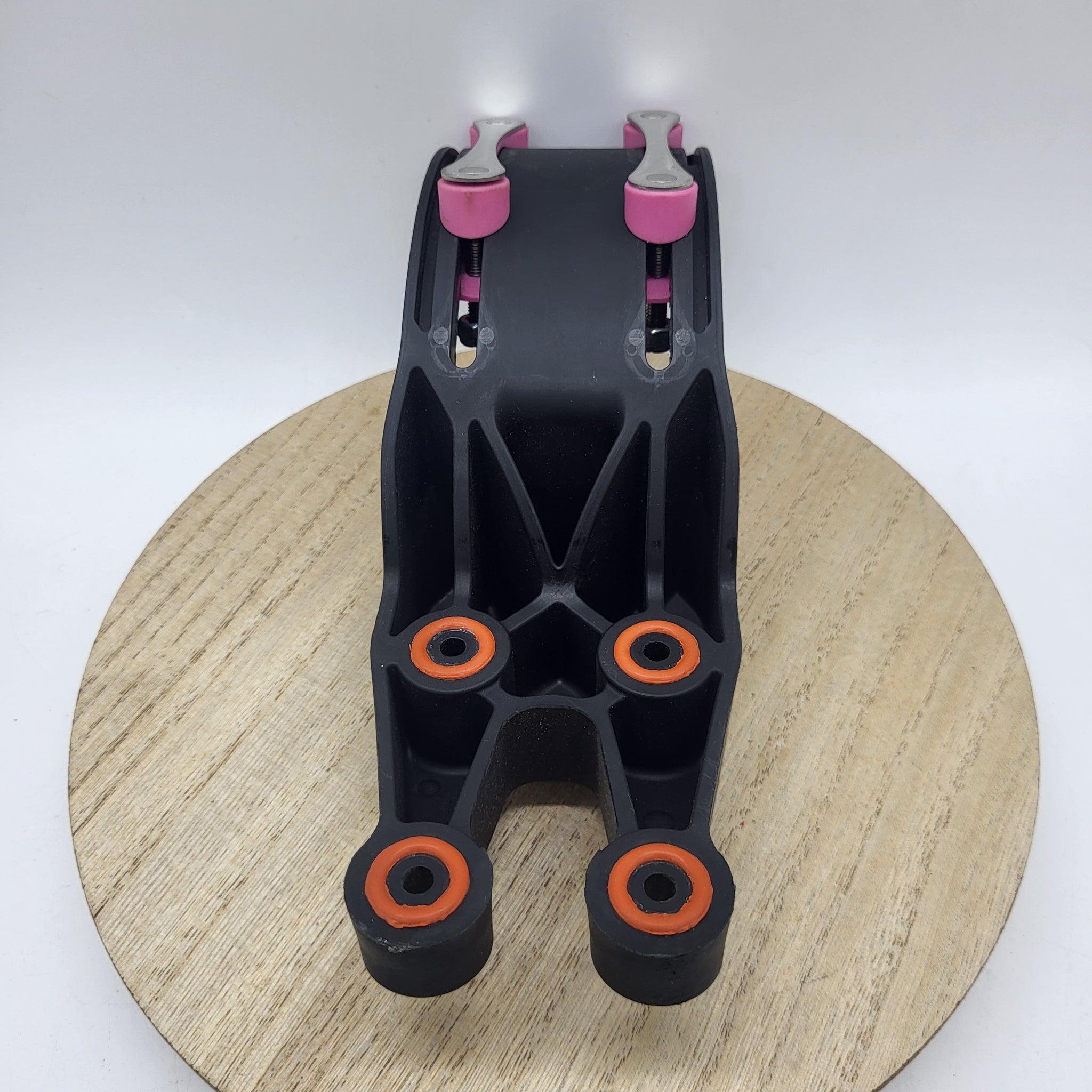 We have minimized the need for shock pads by integrating robust and compliant O-rings to protect the bracket and deck interface. With the addition of 2mm of riser at the truck the composite series brackets are Paris truck compatible. A recess down the center of the deck interface accommodates heavy concave platforms. Screws and nuts have also been recessed in pockets. This adds strength to the bracket and protects the fasteners from impacts.